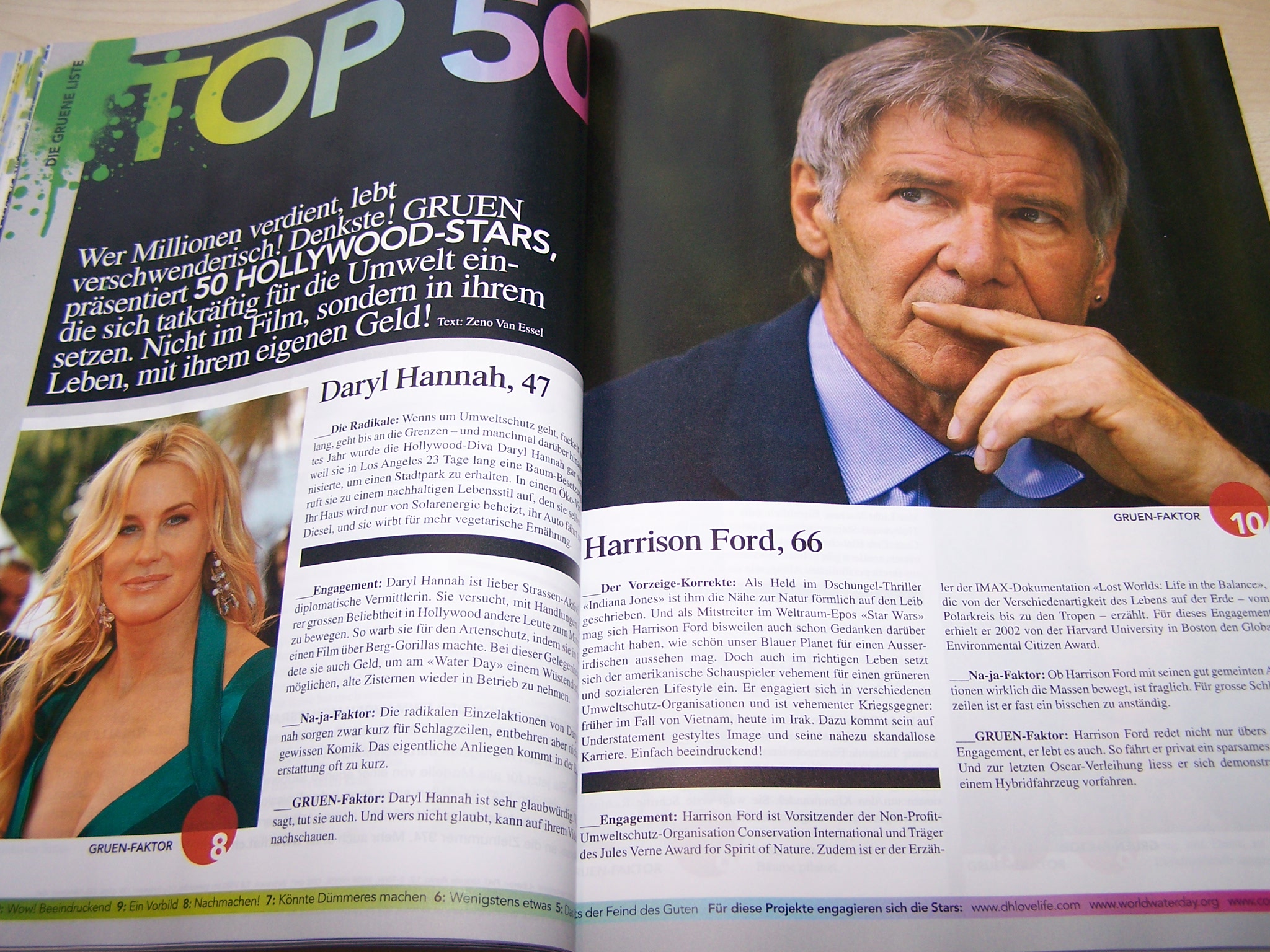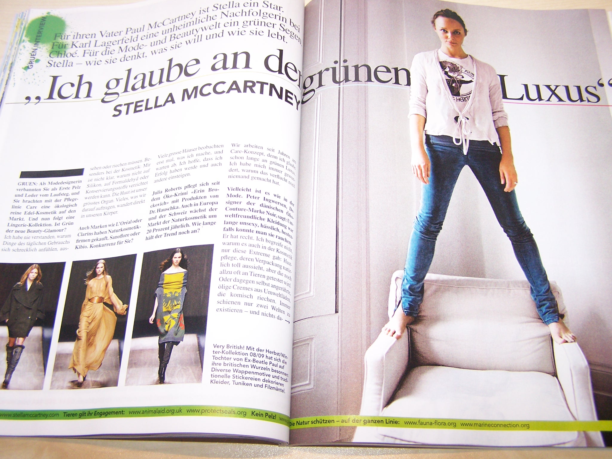 Dicke Post kommt aus der Schweiz. Zur Schweizer Illustrierten (SI) gibt es jetzt viermal im Jahr zusätzlich eine grüne Ausgabe gratis obendrauf. Die erste Ausgabe der SI Gruen ist mit 124 Seiten dick und sehr gala-esk. Es gibt Interviews mit Stars, Politikern und Unternehmern, die sich für eine bessere Welt engagieren. Neben der „Grünen Liste“ – das sind die Top-50-Hollywoodstars, die sich sozial und umweltpolitisch engagieren gibt es auch eine Modestrecke, die sich aber nur mit Stella McCartney beschäftigt, die als erste Designerin Pelze und Leder vom Laufsteg verbannt ist. Stella ist Tierschützerin und Vertreterin der reinen Lehre. Sicher hat die britische Modemacherin Eco-Glam, aber die Schweiz hat in Sachen grüner Mode auch selbst einiges zu bieten, etwa Switcher oder Naturaline Biobaumwolle, die bei der Supermarktkette Coop zu haben ist und von der Schweizer Remei AG gemacht wird, einem Pionier der Branche. Vielleicht in der nächsten Ausgabe?