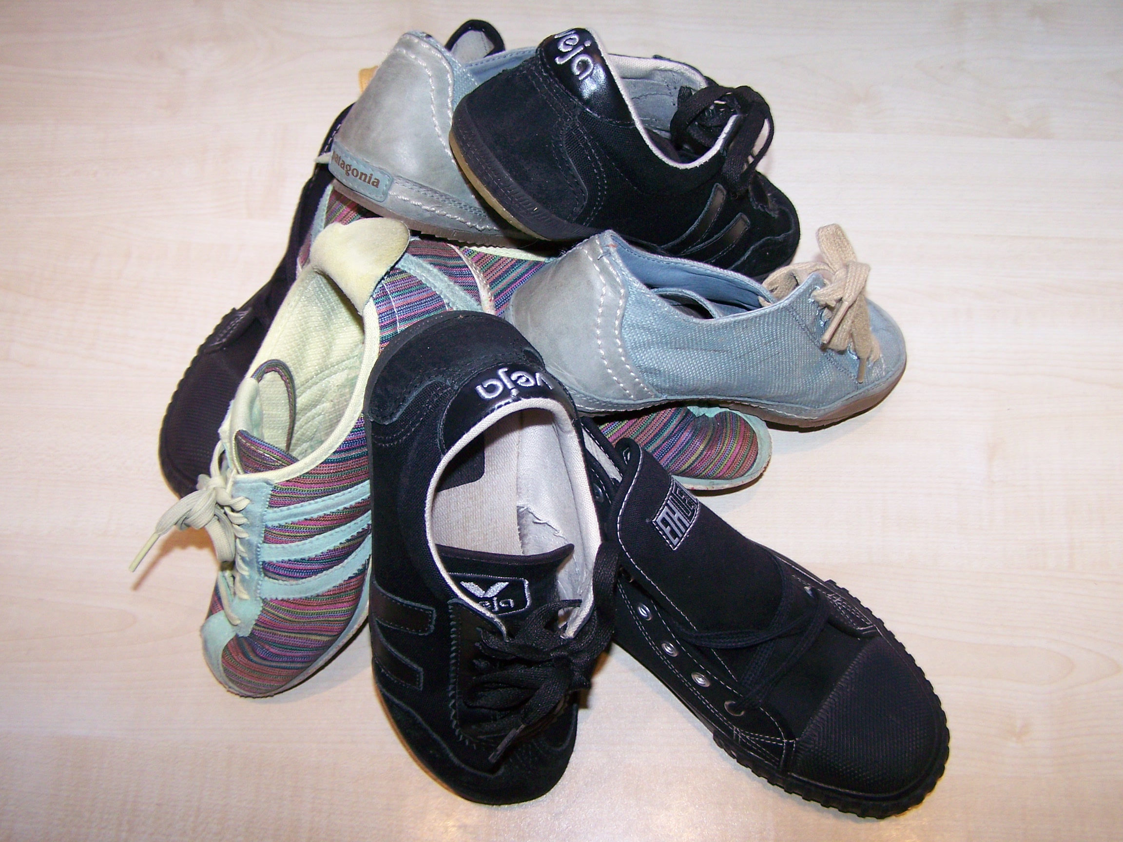 Mode mit Botschaften gefällt mir ja aber, wie ihr wisst. Und so habe ich mal meine Schuhe sortiert, um sie auf ihre Tauglichkeit als Protestmittel zu testen. Da gibt es Hanf-Treter von Patagonia, Ethletics mit Latex aus vorbildlich bewirtschafteten Wäldern, fair gehandelte Veja-Sneaker aus Brasilien und Schuhe aus Recycling-Material von Adidas grün. Das sind gute Nachrichten für all diejenigen, auf die ich gerne werfen würde.