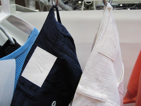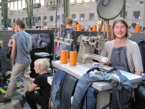 Neben KnowledgeCotton ist nudie Jeans die ganz große Erfolgsgeschichte von grüner Mode im Mainstream-Markt. Gemessen am Erfolg der Marke sind die Messeauftritte schon echt ein erstaunliches Understatement, im positivsten Sinne. Hier steht wirklich das Produkt und das Konzept im Vordergrund. Diesmal gab es einen Rundkurs um eine Repair-Station, wie nudie sie auch in seinen Flagship-Stores hat. In 4 Etappen wurde nudies Jeans-Kreislauf vorgestellt. „Breaking In“, also die rohe, unbehandelte Dry Denim eintragen. Dann irgendwann „Repair“. Wer nicht auf stärker reparierte Hosen steht, kann diese für ein „Re-Use“ in den nudie-Läden abgeben (gegen Rabatt auf eine neue) und die machen dann ein Designereinzelstück daraus, was sie weiterverkaufen. Und schließlich recycelt nudie aufgetragene Jeans zu neuem Denim und mischt dabei frische Bio-Baumwolle bei.