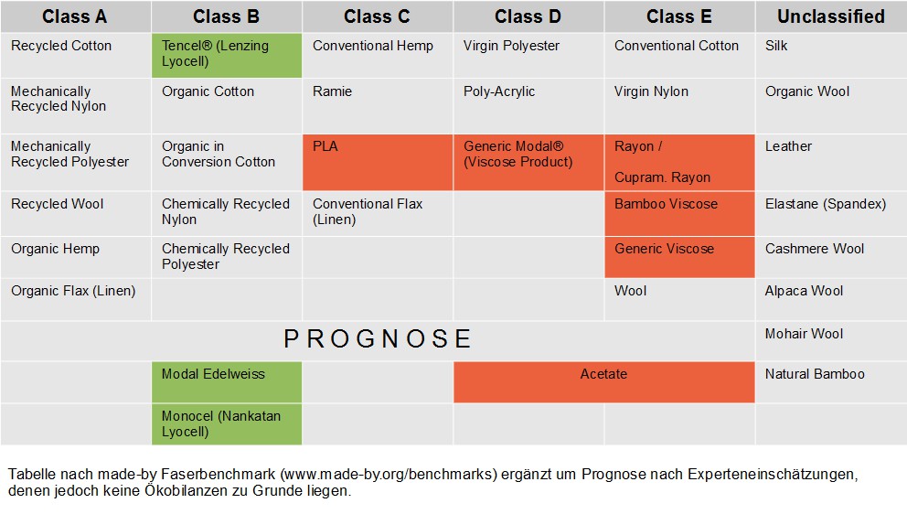 Der made-by Faser-Benchmark basiert auf richtigen Ökobilanzen und vergleicht diese unter einander. Für Monocel ist das noch nicht erfolgt. Da es sich jedoch letztlich um eine Lyocell-Fasern handelt, dürfte Monocel nach Einschätzung von Experten wohl auch in Klasse B einzuordnen sein.