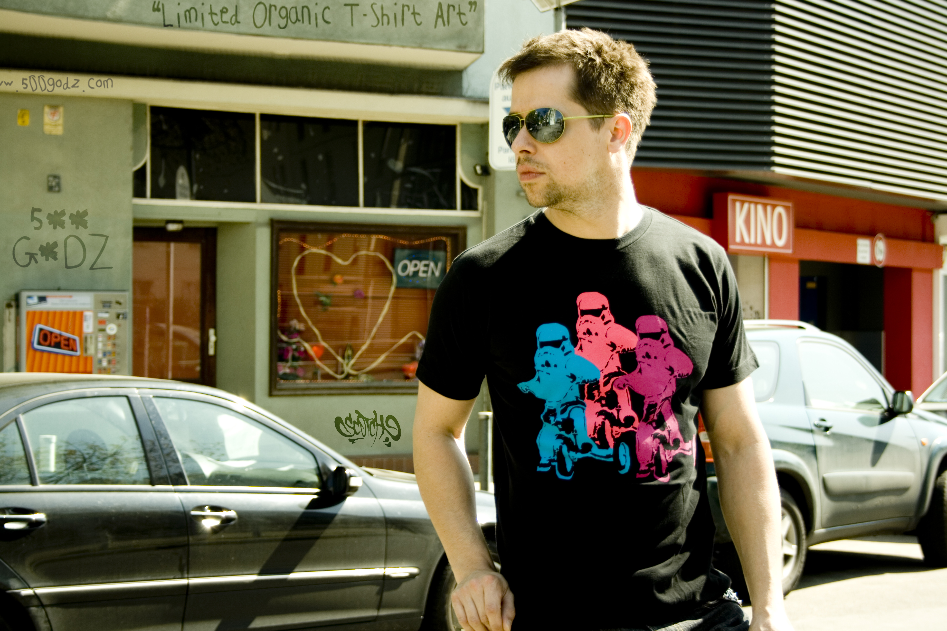 Der Wunsch nach Veränderung hat Daniel Schramm getrieben. Seinen Job bei Sony Music war er los und auf der Suche nach was Neuem. Und so kam er auf die T-Shirts und was er vorher auf die Platten gepresst hatte, landete nun auf der Kleidung: Kunst. „Die Shirts sind eine Leinwand für die Künstler“, sagt Daniel, der mit Streetart-Künstlern arbeitet. Und weil die keine Massenware wollen, werden nur Kleinserien gemacht. Die Auflage sollte auf maximal 500 Stück begrenzt sein – daher der Label-Name 500godz.