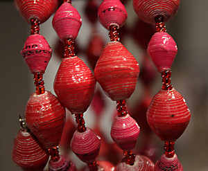 Eine meiner persönlichen Lieblingsentdeckungen ist die finnische Firma Mifuko. Zu entdecken gab es hier allerlei, bei einem Sortiment von Sandalen über Taschen und Portemonnaies bis Accessoires und sogar Heimdeko. Das von Minna Impiö und Mari Martikainen 2009 gegründete Label steht für skandinavisches Design in Verbindung mit traditioneller, afrikanischer Handwerkskunst. In Zusammenarbeit mit Werkstätten in Kenia entstehen die Produkte mit dem Schwerpunkt auf Materialrecycling und Fair Trade Beziehungen. Minna lebt seit vier Jahren vor Ort und kennt so gut wie alle Kunsthandwerker die für sie arbeiten beim Namen. Absolut faszinierend fand ich den Schmuck mit Perlen aus gerolltem Altpapier und einer Lackierung, die aussehen wie richtige Glasperlen und kleinen Anhängern aus recyceltem Aluminium (Kostenpunkt 30€). Toll durchdacht sind auch die Taschen mit einem Innenfutter aus alten Herrenhemden und einem verstärkten Boden aus Autoreifen (98€).