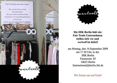 Nicht hauen, nicht klauen, gerecht teilen, zwei gegen einen ist gemein – das gilt nicht nur in der Sandkiste, sondern auch beim fairen Handel. Und so ganz ohne Ramboallüren lässt sich auch Mode produzieren. Die Industrie- und Handelskammer (IHK) in Berlin plant für den 14. September erstmals eine Konferenz zum Thema Fairtrade. „Allein im Jahr 2008 ist der Absatz fair gehandelter Produkte in Deutschland um 38 Prozent gestiegen“, sagt Antje Meyer vom Arbeitskreis Unternehmensverantwortung der IHK. Zu den Unternehmen, die sich vorstellen, gehören die Betreiberinnen des Berliner Ökomodeladens Wertvoll, die inzwischen auch bloggen.