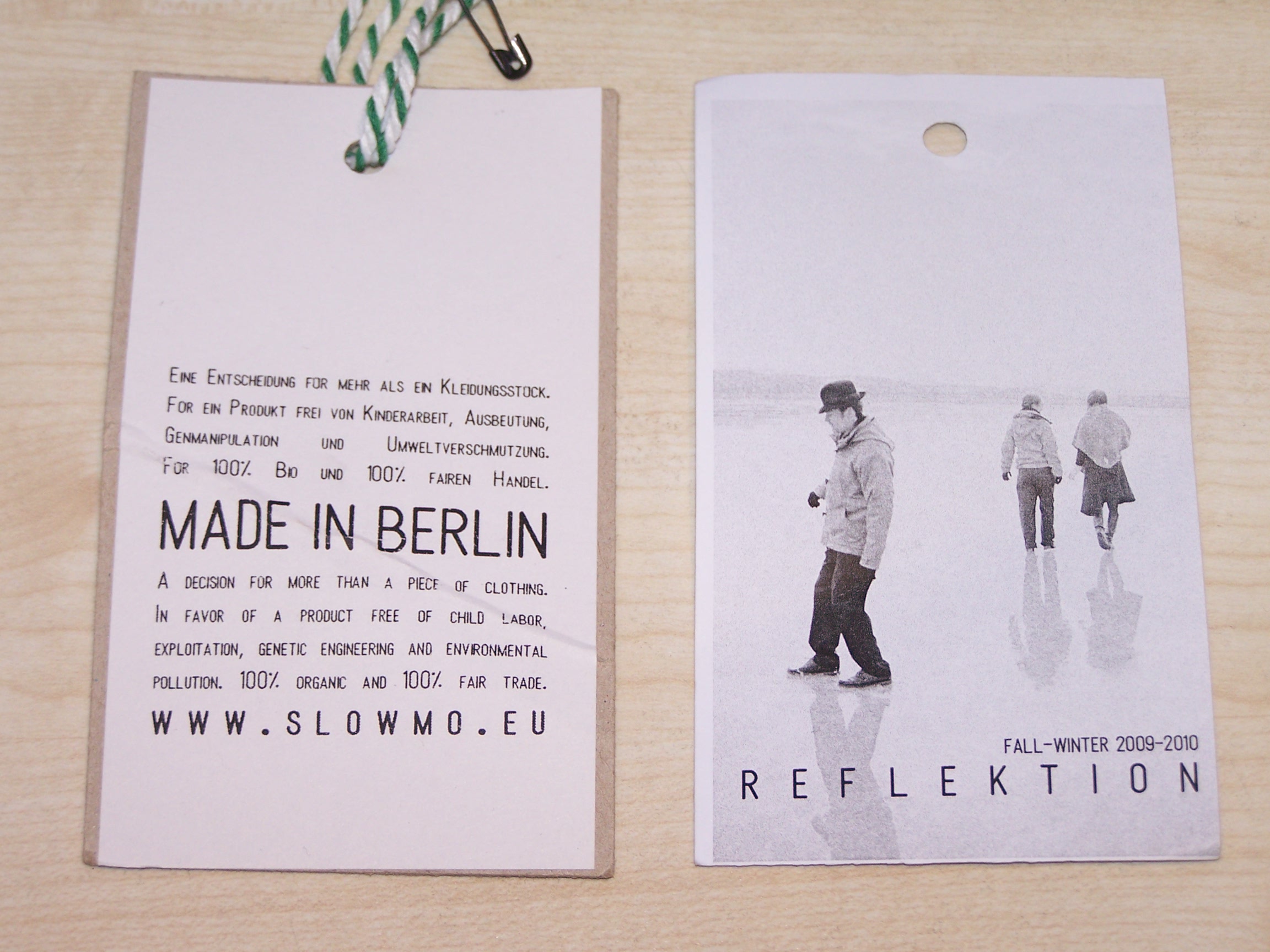 „Eine Entscheidung für mehr als ein Kleidungstück, für ein Produkt frei von Kinderarbeit, Ausbeutung, Genmanipulation und Umweltverschmutzung. Für 100% Bio und 100% Fairen Handel. Made in Berlin.“ Felicia und Melchior Moss von Slowmo geht es darum, Auge und Gewissen zu überzeugen, ihre Etiketten spiegeln beides. Slowmos aktuelle Kollektion