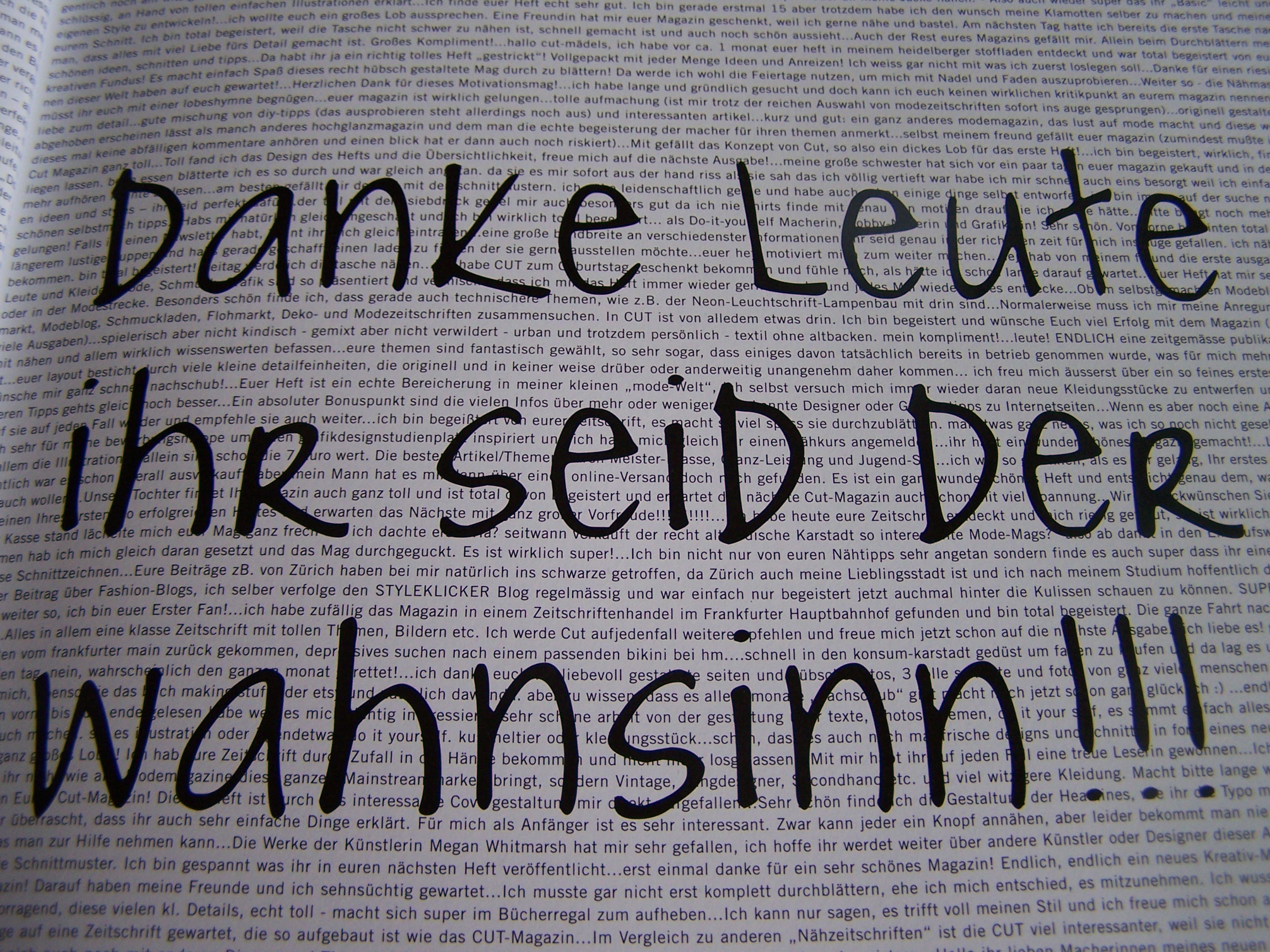 So charmant kann sich eine Redaktion für einen wirklich großen Haufen Leserlob bedanken. Es kam so viel Post auf die erste Ausgabe von CUT, dass sie nur als XXS-Version abgedruckt werden konnte. Olle-Klamotten-Zeitschrift hätte man denken können, aber die Münchner Klamotten-Ladies haben diesen XXL-Trend zum Selbermachen mit so viel Rock n`Roll in ein Heft umgesetzt, dass ich fast zehn Euro für die zweite Ausgabe hingelegt habe.