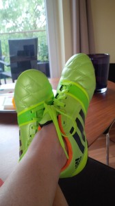 Es ist sicher das erste Mal, das ich die Füße auf den Tisch gelegt habe bei Greenpeace. Es ist auch das erste Mal, dass ich Fußball-Schuhe anhatte. Und dann noch welche aus der WM-Kollektion von adidas. Sie sind übriggeblieben bei unseren Greenpeace-Tests. Und sie sind ein Statement. Denn heute feiern wir.