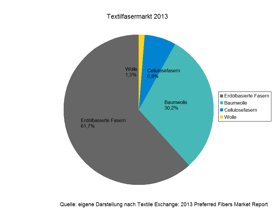 Am Gesamttextilmarkt nehmen Cellulosefasern, zu denen sowohl konventionelle Viskosen als auch Lyocell (Tencel, Monocel) zählen mit 6,8 Prozent den drittren Rang ein, verzeichnen jedoch das stärkste Wachstum. Wolle kommt immerhin noch auf 1,3 Prozent. Dabei ist zu beachten, dass die Studie Jahrensvolumen misst und Wolle natürlich sehr saisonlastig ist. Zugleich sind Wollpullover, die zumindest überwiegend wirklich aus Wolle bestehen, im konventionellen Handel eine Seltenheit geworden. Die höheren Anteile liegen hier auch auf Produktebene meist bei Acryl, Polyester und Viskose.