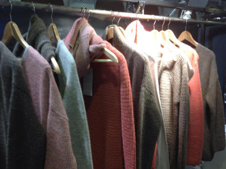 In der „Green-Area“ der Halle 1 waren diesmal weniger grüne Labels versammelt. Die jedoch freuten sich über regen Zuspruch. Les Racines du Ciel fokussiert sich in Winterkollektionen stehts auf wunderbare Alpaca-Strickqualitäten. In der gezeigten Kollektion spielt das fränzösische Label mit verschiedenen Strickmustern und bietet viele Teile sowohl einfarbig, als auch aus 2 verschiedenen farbigen Garnen an. Erstmals gibt es auch eine Auswahl Schals und ein paar Teile in Merinofeinstrick.