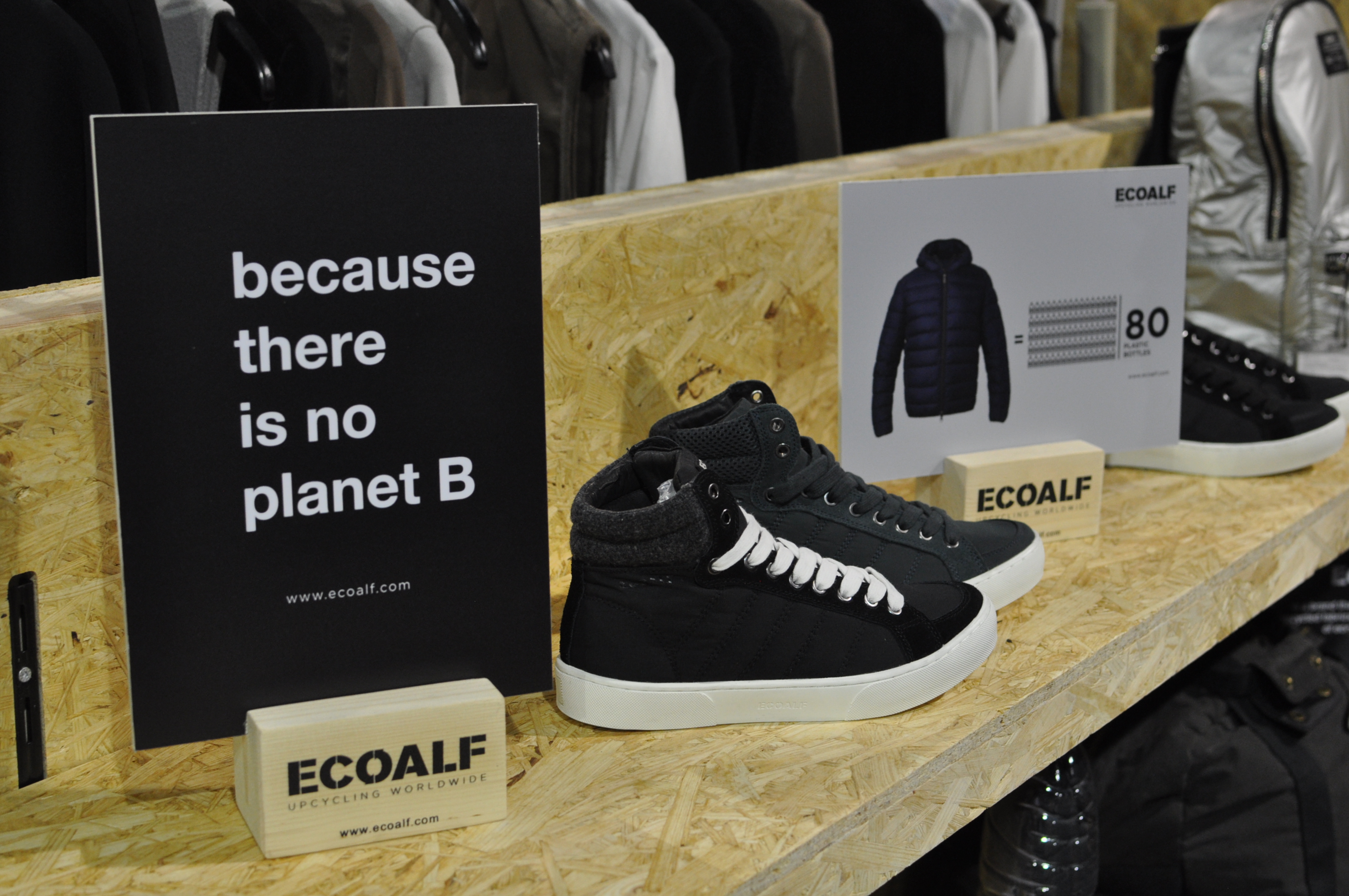 Nur wenige Meter weiter vertiefte ich mich in das Gespräch mit Ecoalf-Gründer Javier Goyeneche. Das Label konzentriert sich auf die Produktion von Taschen und Jacken aus Plastikmüll. An der spanischen Küste etwa hat Ecoalf eine Kooperation mit knapp 400 Fischern geschlossen, die bei einem normalen Fang jeweils 3 Kilo Müll mit an Land bringen. 1,2 Tonnen Müll pro Tag! Natürlich ist das nicht ausschließlich Plastikmüll, doch Javier Goyeneche kann mit dem, was an unterschiedlichen Kunststoffen gesammelt wurde trotzdem gut arbeiten. So werden knapp 20 Tonnen Plastik pro Material dann zu Daunenjacken ohne Daunen, einem Trenchcoat aus zusätzlich wiederverwerteten Bestandteilen von Fischernetzen oder einer Funktionsjacke aus zusätzlich 44 Tassen Kaffee.