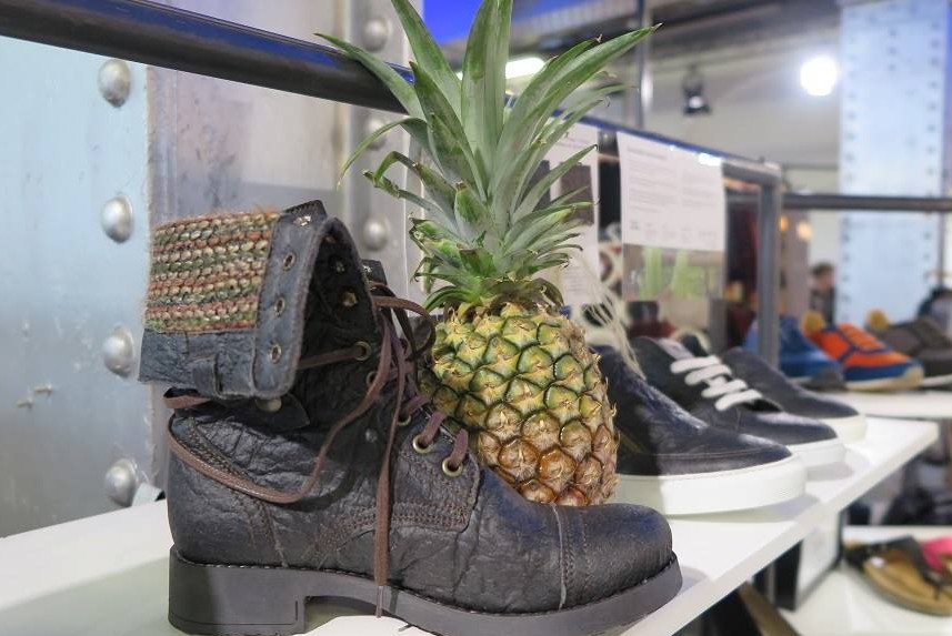 Die vegane Lederalternative ist nicht nur für Taschen interessant, sondern ganz besonders auch für Schuhe. Beim Schuhwerk könnte Pinatex neben der einfacheren Pflege auch durch eine bessere Atmungsaktivität gegenüber konventionellen Kunstledern glänzen. Beim veganen Schuhlabel Nae waren erste Modelle mit Pinatex zu sehen. Ich bin supergespannt, wie sich das Material im Alltag verhält und hoffe bei Zeiten darüber berichten zu können. Die in Berlin gezeigte Variante ist leicht strukturiert und sieht etwas so aus wie Crinkled Leather („geknittertes Leder“). Das Material ist weicher und leichter als Leder, macht aber einen robusten Eindruck.