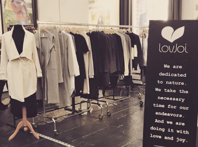 Das junge Team um Lovjoi-Gründerin Verena Paul hat seinen Sitz in der kleinen süddeutschen Stadt Riedlingen. Dort hat Lovjoi eine eigene Produktion in einer alten Werkstatt aufgebaut und liebt die Nähe zur Natur. Das Design der Kollektionen ist hingegen absolut urban und großstadttauglich. Farblich dominieren Schwarz, grau und weiß, aber auch ein paar blaue Teile sind dabei. Für den nächsten Winter gibt es unter anderem lange Sweat-Coats mit und ohne Kapuze und das sogar unisex, also auch für Männer. Aber auch sehr feminine Schnitte sind dabei, wie das Kleid Elling dessen Rockteil vorne kürzer gehalten ist. Alle Lovjoi-Styles sind vegan.