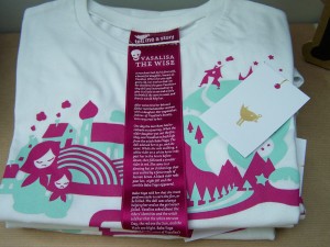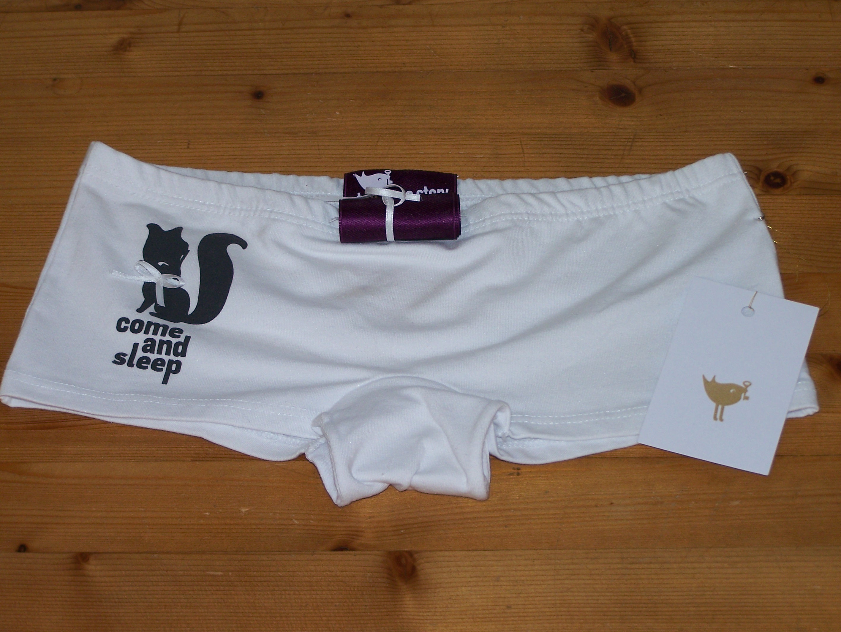 Den entgegengesetzten Weg schlägt Cornelia Seirer vom österreichischen Label „Tell me a story“ ein, wo das Etikett eine wahre Zierde ist und bedeutsamer Bestandteil des Kleidungsstücks. Denn rollt man das mit einem Bändchen verschnürte Etikett auf, so ist auf dem Schild ein komplettes Märchen zu lesen. Jeweils ein Motiv des Märchens setzt sie dann grafisch um – so etwa den Fuchs aus dem Märchen „come and sleep“ auf dem Slip. Natürlich will sich niemand mit dem Röllchen am Steißbein hinsetzen und so gibt es eine Schnittkante. Mein Märchen habe ich zuerst gelesen, dann abgeschnitten und nun ruht es in einer Schublade – als Erinnerung an Linz.