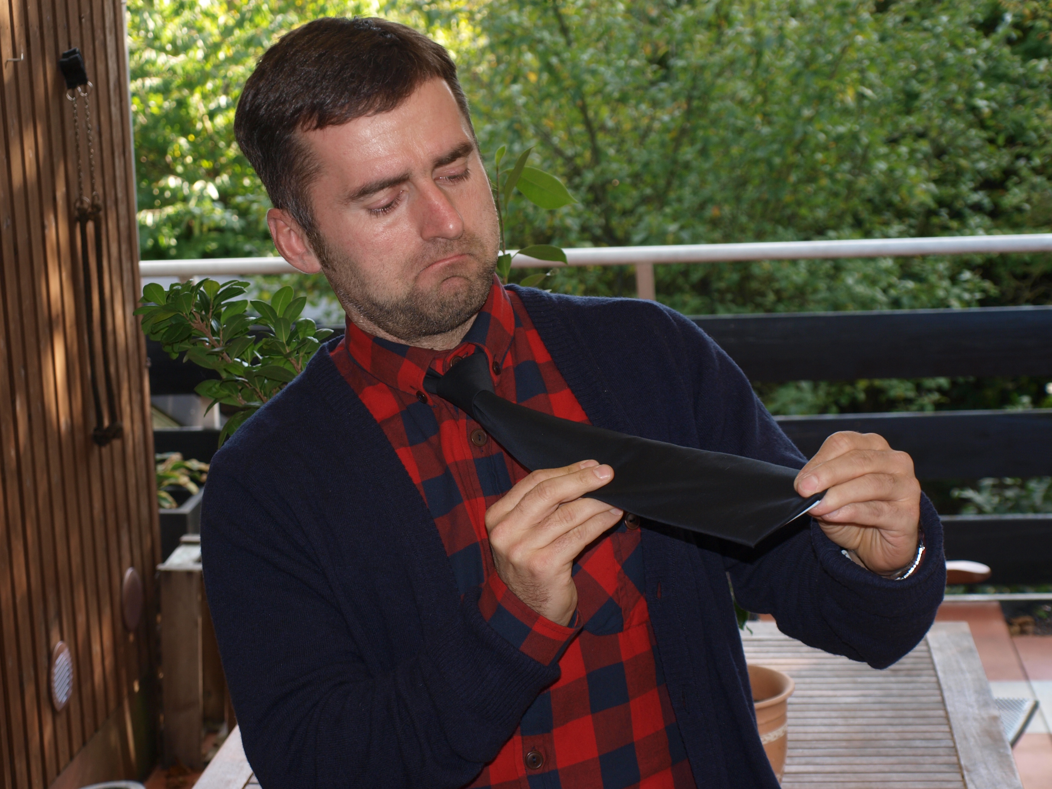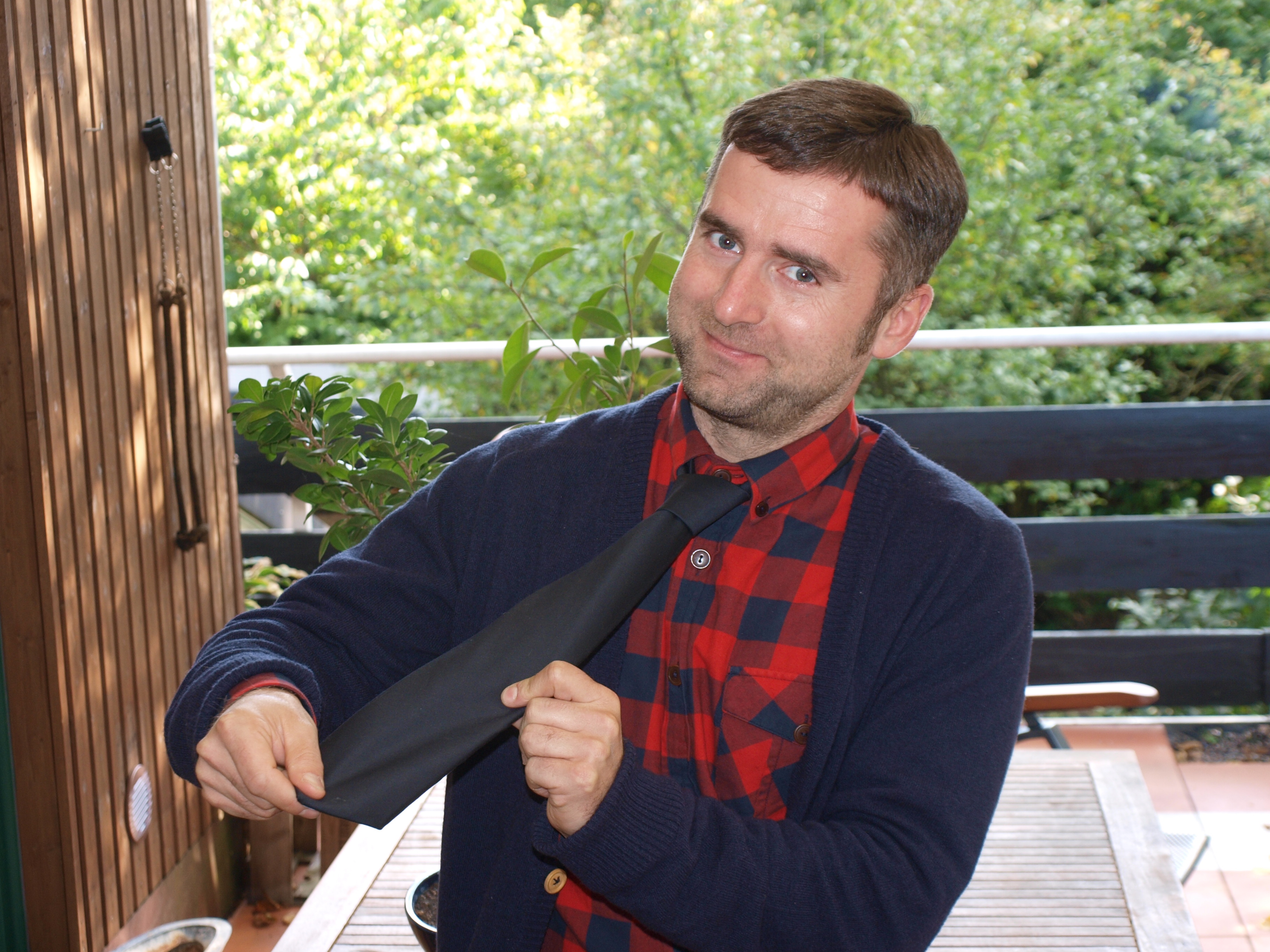 Sieht der Mann nicht gut aus? Ich dementiere jetzt, dass mann, um bei mir am Sonntag zum Frühstück eingeladen zu werden, eine Krawatte tragen muss. Wahr ist, dass ich Bernd Hausmann von glore erst habe essen lassen und ihn dann genötigt habe, den neuen Stern am Firmament der Eco Fashion umzubinden: eine Krawatte aus Biobaumwolle. Dabei ist das gute Stück etwas kurz und außerdem noch ein Prototyp, den ich Matthias Hebeler von Brainshirt in Linz abgeschwatzt habe. Aber einen Knoten haben wir trotzdem geschafft. Zum feinen Strick-Sortiment von Brainshirt passen die Binder ganz ausgezeichnet – natürlich in mehr Farben als nur Grau und Schwarz.